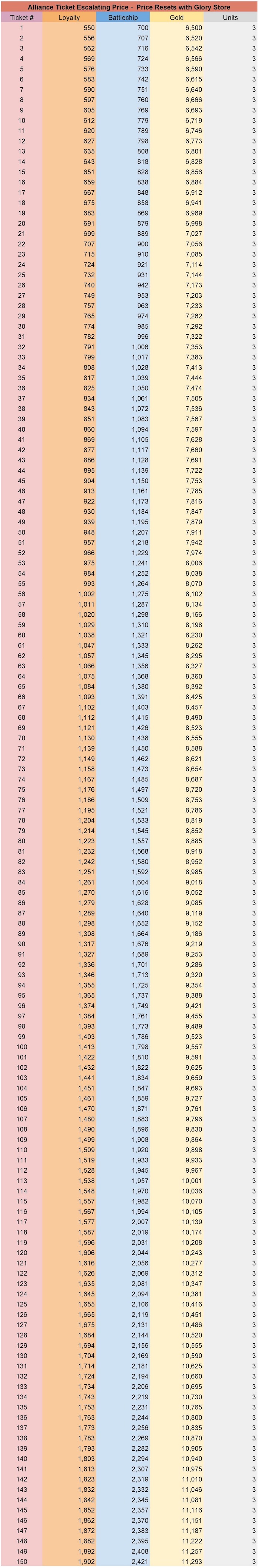 Note: The cost mentioned below in the table is based on each week’s ticket purchase from the Glory Store. The price of the ticket increase every next ticket when bought using Gold, BC or Loyalty (not applicable when bought using units)