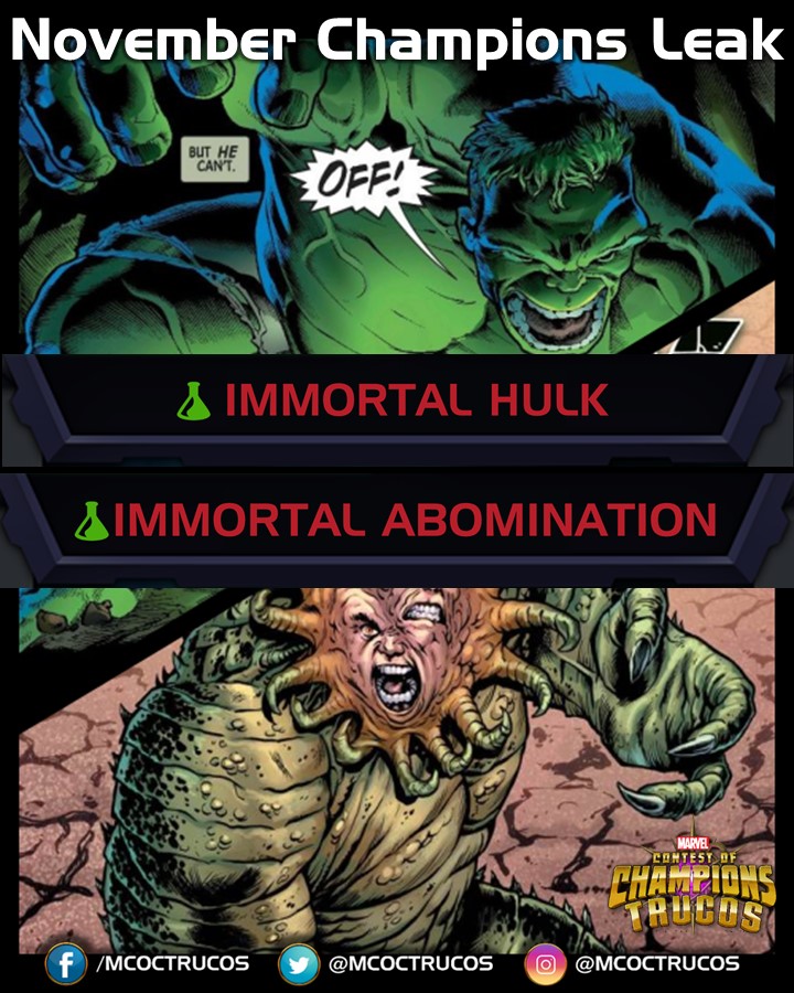 Kabam releases 2 Champions every month along with other updates. Next Month (November 2020) is supposed to bring 2 new champs as well that has not been announced so far. However, Kabam is expected to release Immortal Hulk and Immortal Abomination.