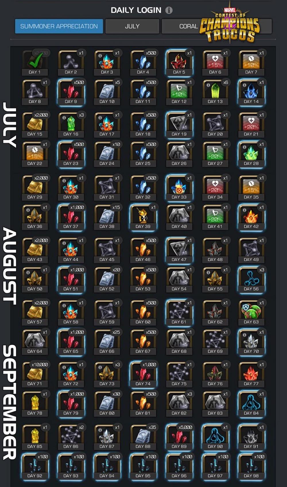 - You have 105 Days to collect all rewards. +1 Day has been added because the calendar was not appearing for many summoners.